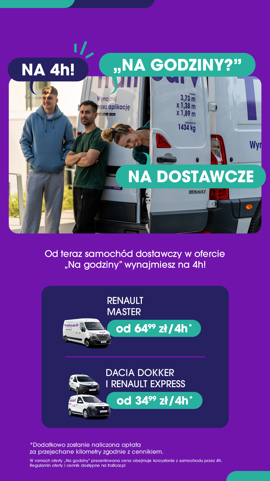 Od teraz w ofercie "Na godziny" dla samochodów dostawczych masz 4 godziny. Na przeprowadzkę, na dojazdy, na spokojnie. Renault Master od 64,99/4h Dacia Dokker i Renault Express już od 34,99/4h. Sprawdź szczegóły oferty Na godziny w zakładce cennik.