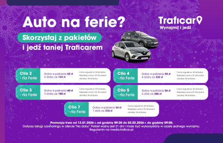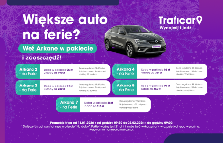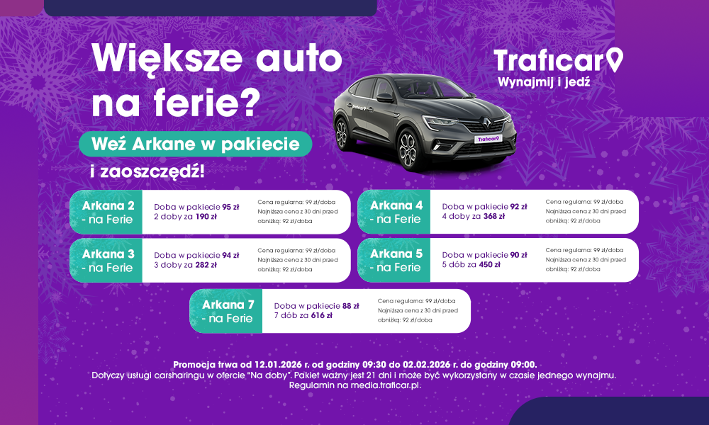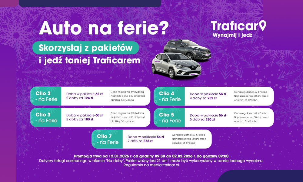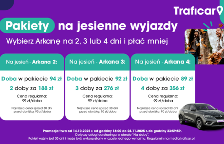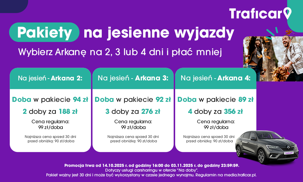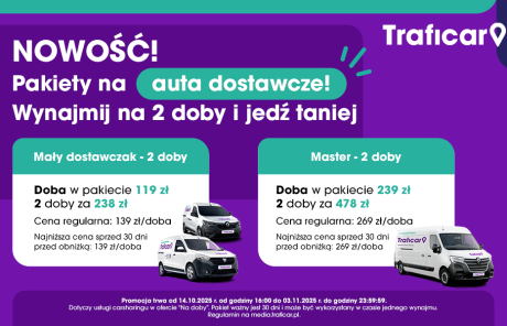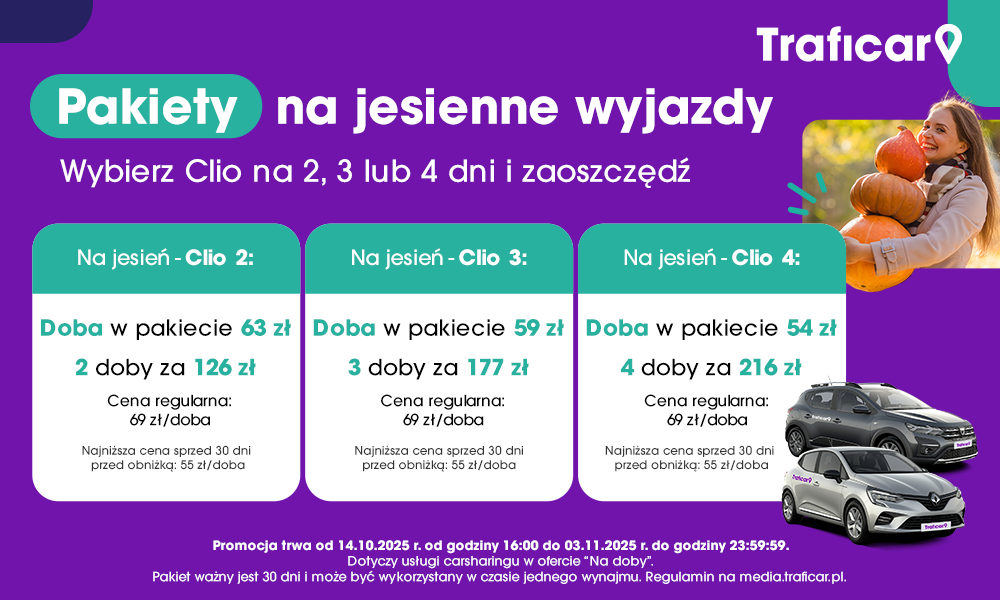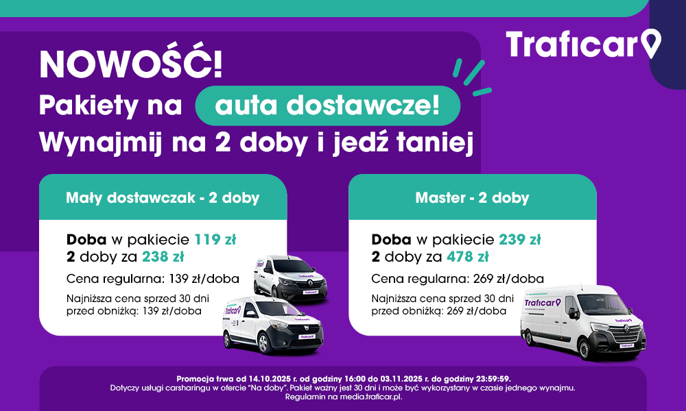 Szczegóły: Pakiet dotyczy usługi carsharingu w ofercie „Na doby”. Pakiet ważny jest 60 dni i może być wykorzystany w czasie kilku najmów, do wyczerpania puli dób w pakiecie. Inne opłaty z oferty pozostają bez zmian. Regulamin na media.traficar.pl