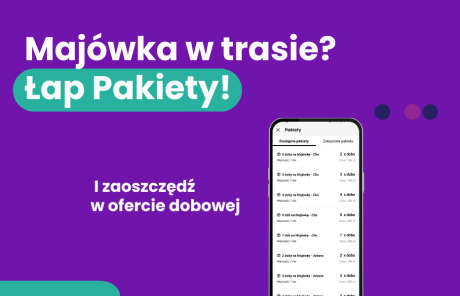 Szczegóły oferty: Pakiet obowiązuje tylko na przejazdy w ofercie „Na kilometry”. Inne opłaty z oferty pozostają bez zmian. Kolejny pakiet 200 km +20 gratis możesz kupić po jego pełnym wykorzystaniu lub po 30 dniach od jego zakupu.