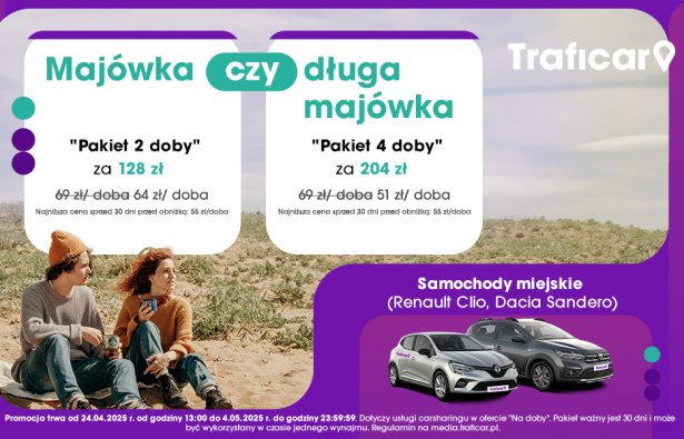 W ramach oferty „Na godziny” prezentowana cena obejmuje korzystanie z samochodu przez 3 h. Regulamin oferty i cennik dostępne na traficar.pl.